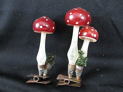2-VINTAGE hand blown glass clip-on CHRISTMAS ORNAMENTS MUSHROOMS