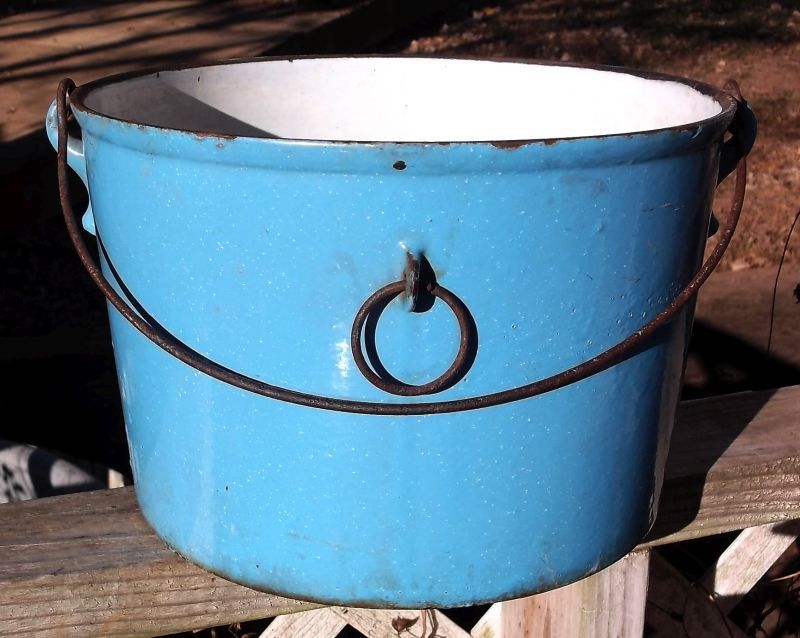 Title (ebay affiliate link): Antique Blue White Enameled Cast Iron Camp Fire 10 QT KETTLE BEAT POT with Bail