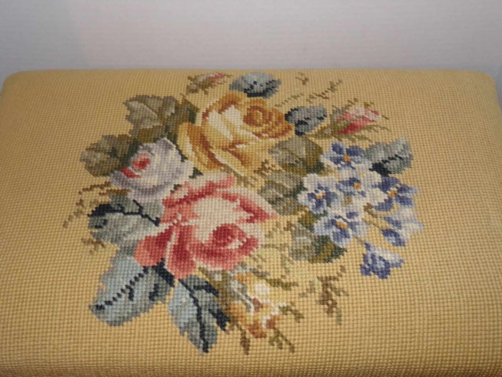 Title (ebay affiliate link): ANTIQUE RECTANGULAR FOOTSTOOL PETIT POINT NEEDLEPOINT ROSES NAIL HEADS FLORAL