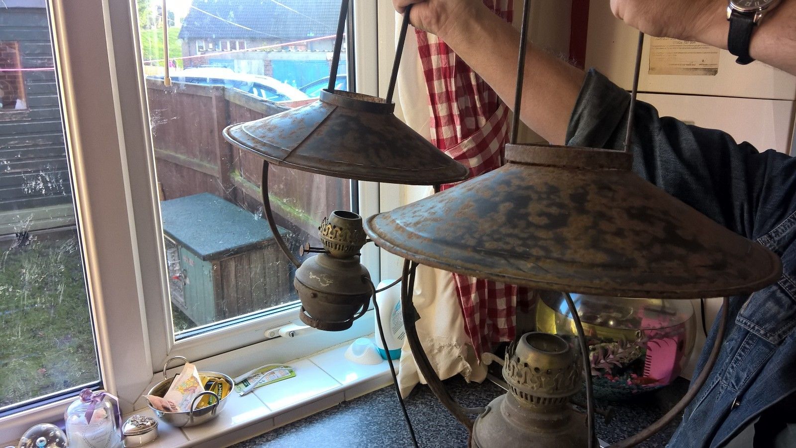 Title (ebay affiliate link): PAIR OF VINTAGE BRASS OIL LAMPS WITH METAL SHADES AND HOLDRES