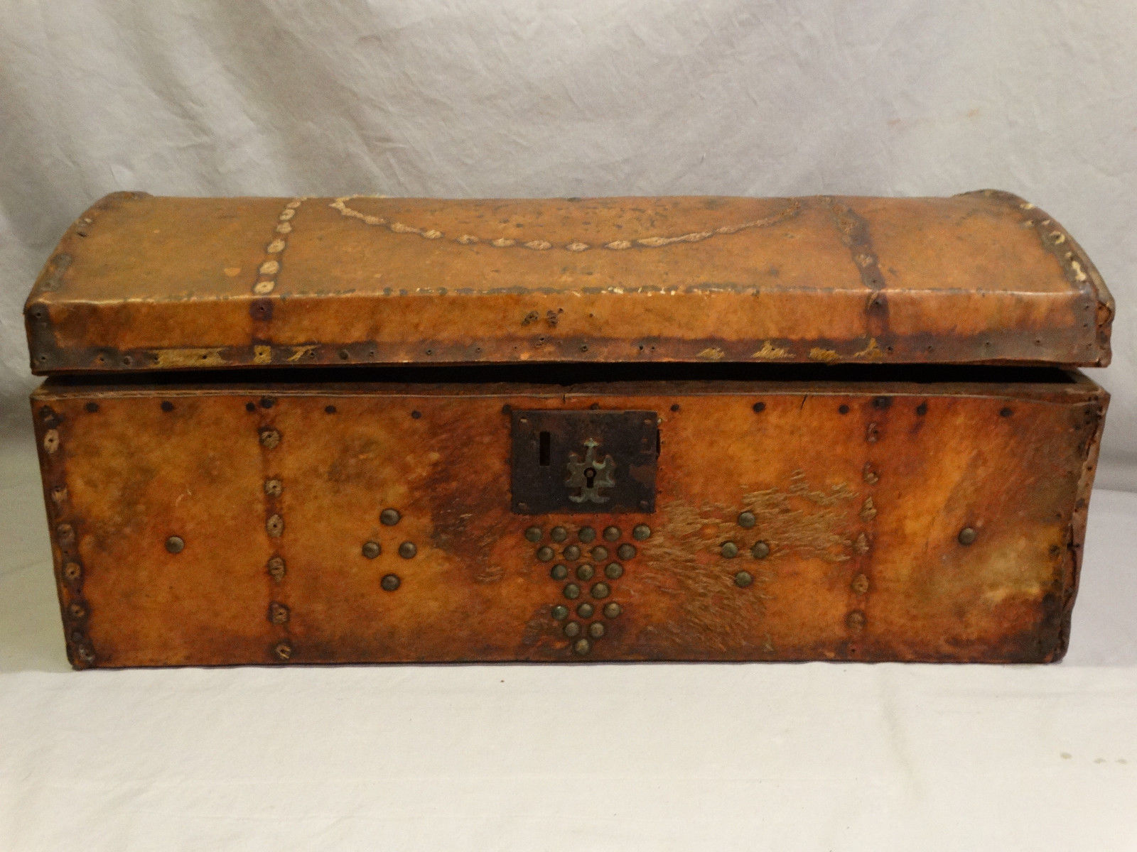 Antique 19thC Primitive BRASS TACK & ANIMAL HIDE DOME TOP Trunk MARRIAGE CHEST