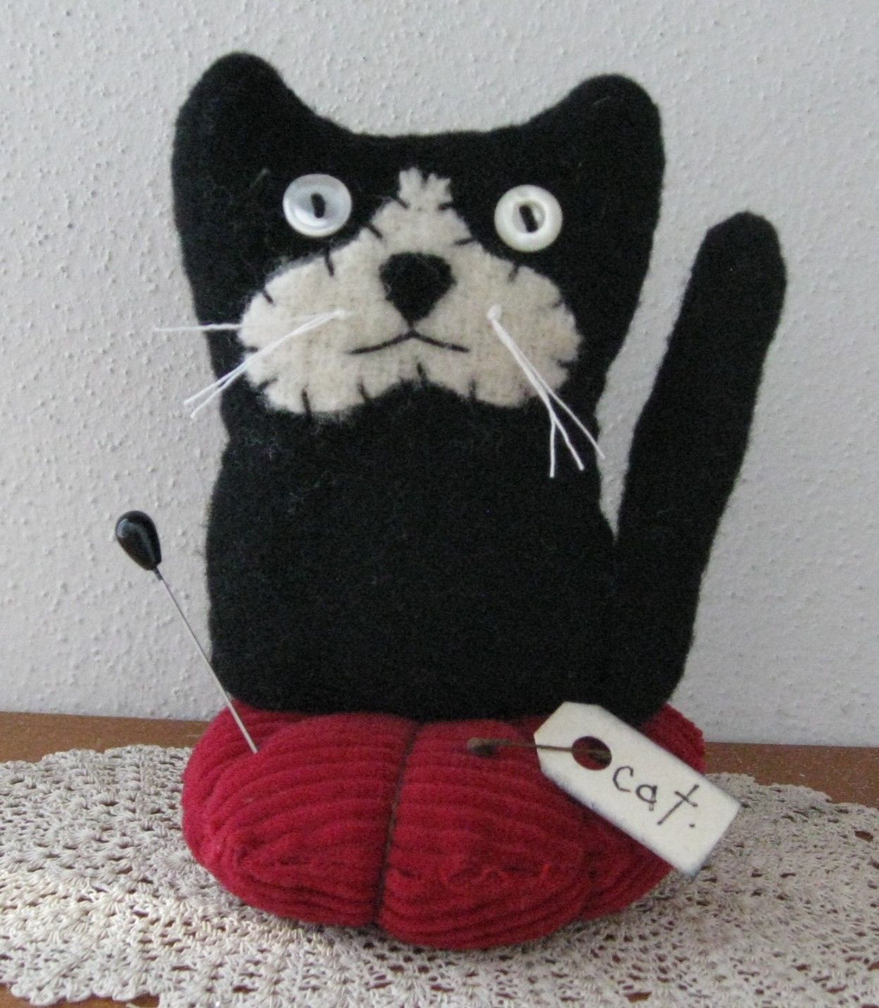 Title (ebay affiliate link): PRIMITIVE WOOL TUXEDO BLACK CAT MAKE DO DOLL PIN CUSHION PFATT