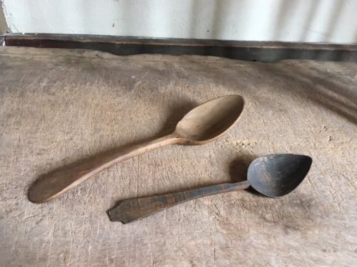 Antique Pair Set Large Old Wooden Treen Serving Spoons Handmade AAFA