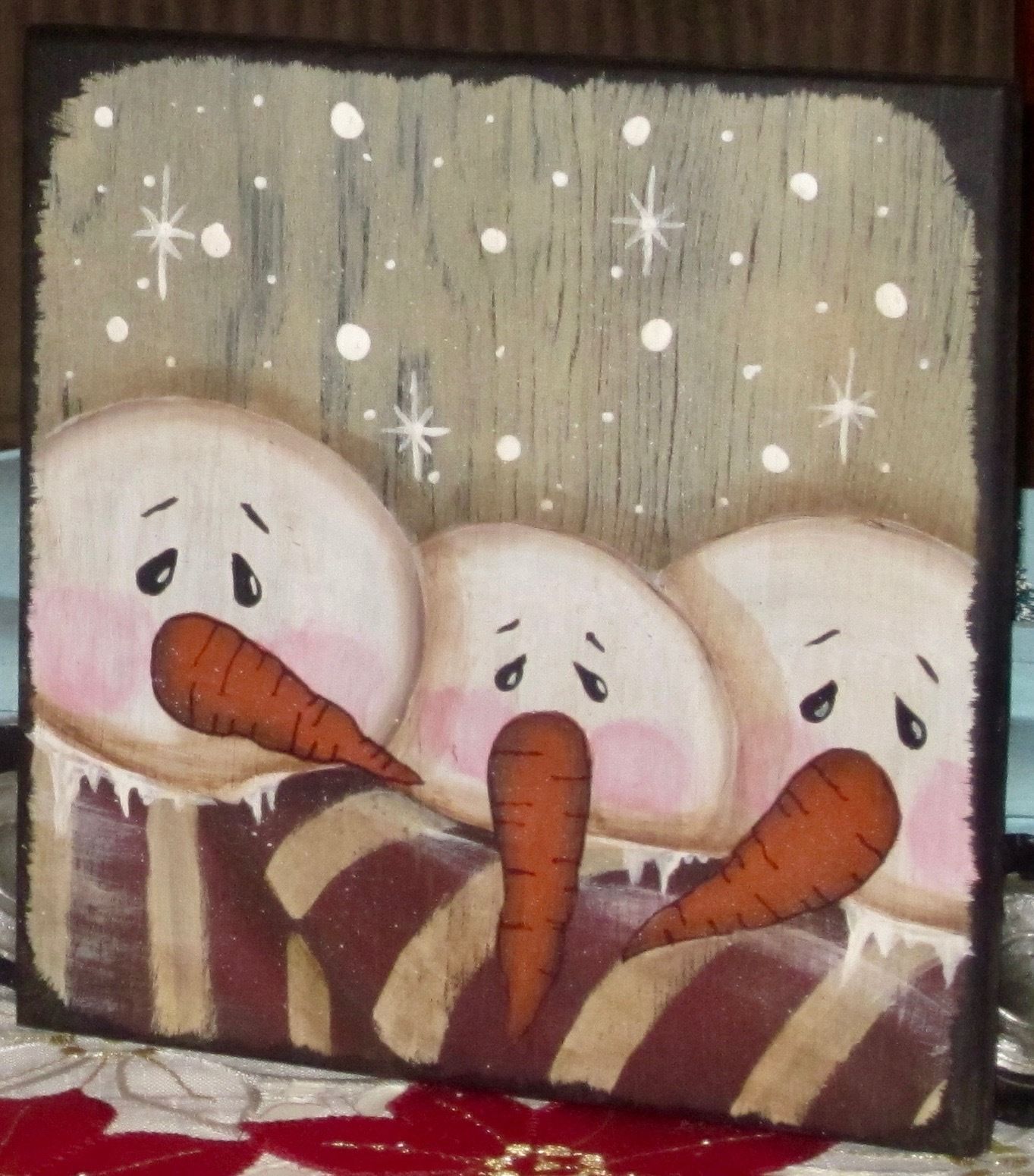 *~*PRIMITIVE*~* HP FOLK ART PRIM SNOWMEN TRIO *~* WINTER *~* BOARD