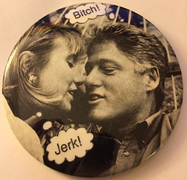 Title (ebay affiliate link): Humorous and Sarcastic 3" Anti-Hillary and Bill Clinton Political Pinback Button
