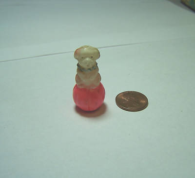 vintage celluloid tiny roly poly puppy on top of ball