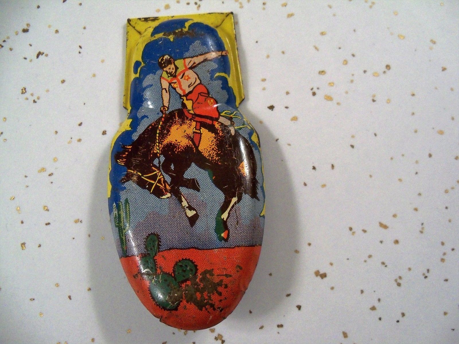 Title (ebay affiliate link): VINTAGE RODEO COWBOY ON HORSE KIRCHHOF TIN LITHO NOISE MAKER CLICKER