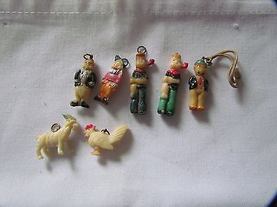 Lot of 7 Vintage Celluloid/Plastic Character Charms/Popeye/Dwarf/Rooster/Goat