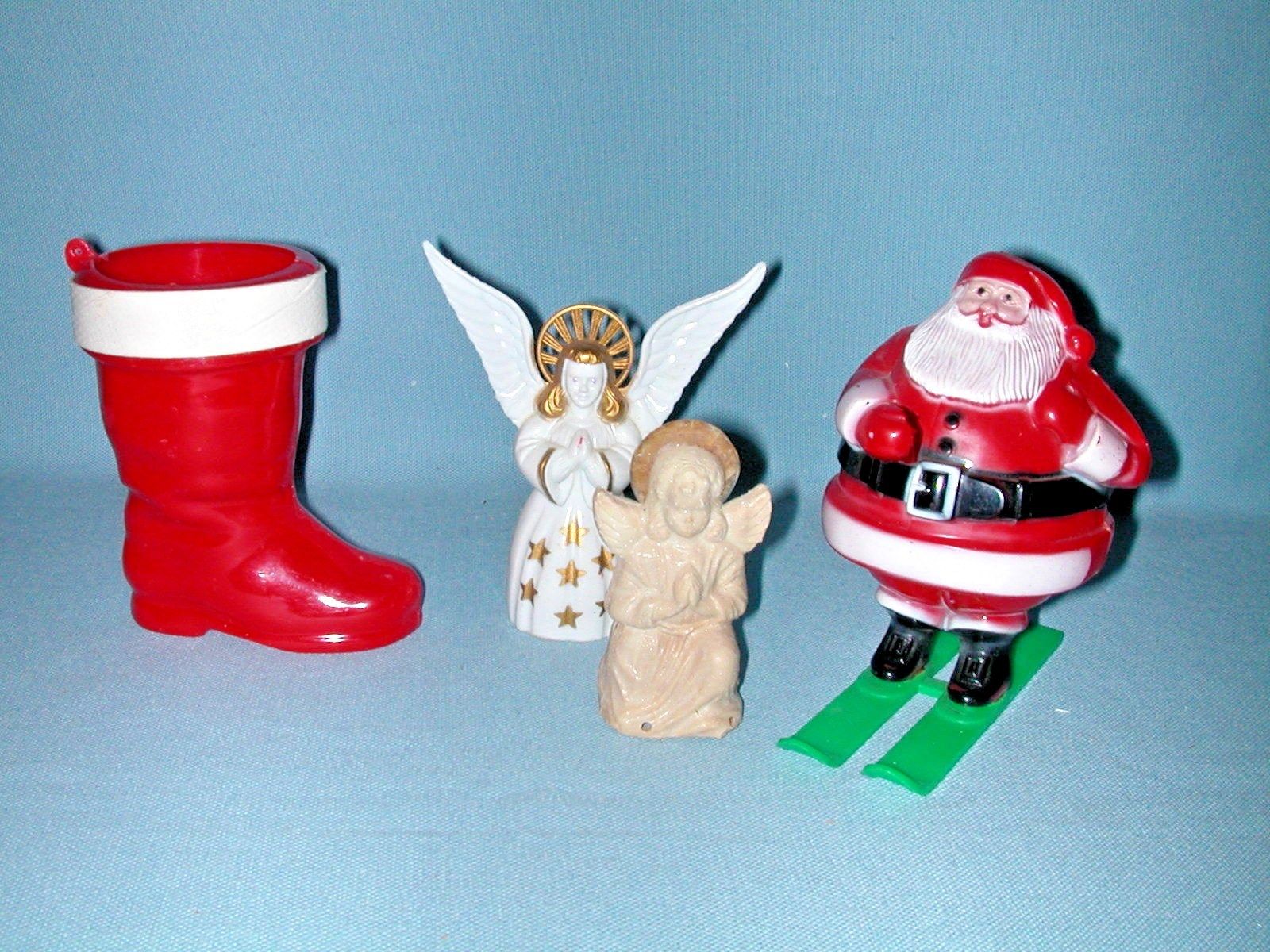 4 Vtg Xmas Ornaments Figures Rosbro Plastic Santa On Skis Boot Celluloid Angel