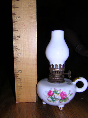 VINTAGE MINIATURE OIL LAMP PORCELAIN,MILK GLASS CHIMNEY