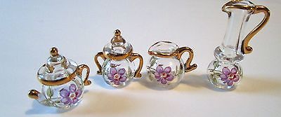 Title (ebay affiliate link): *VINTAGE Elegant Miniature Glass Gold Trim Purple Floral Dollhouse Size Tea Set