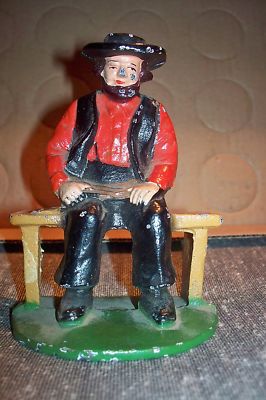 VINTAGE CAST IRON AMISH FIGURE ON BENCH 4 3/4 in SEATED