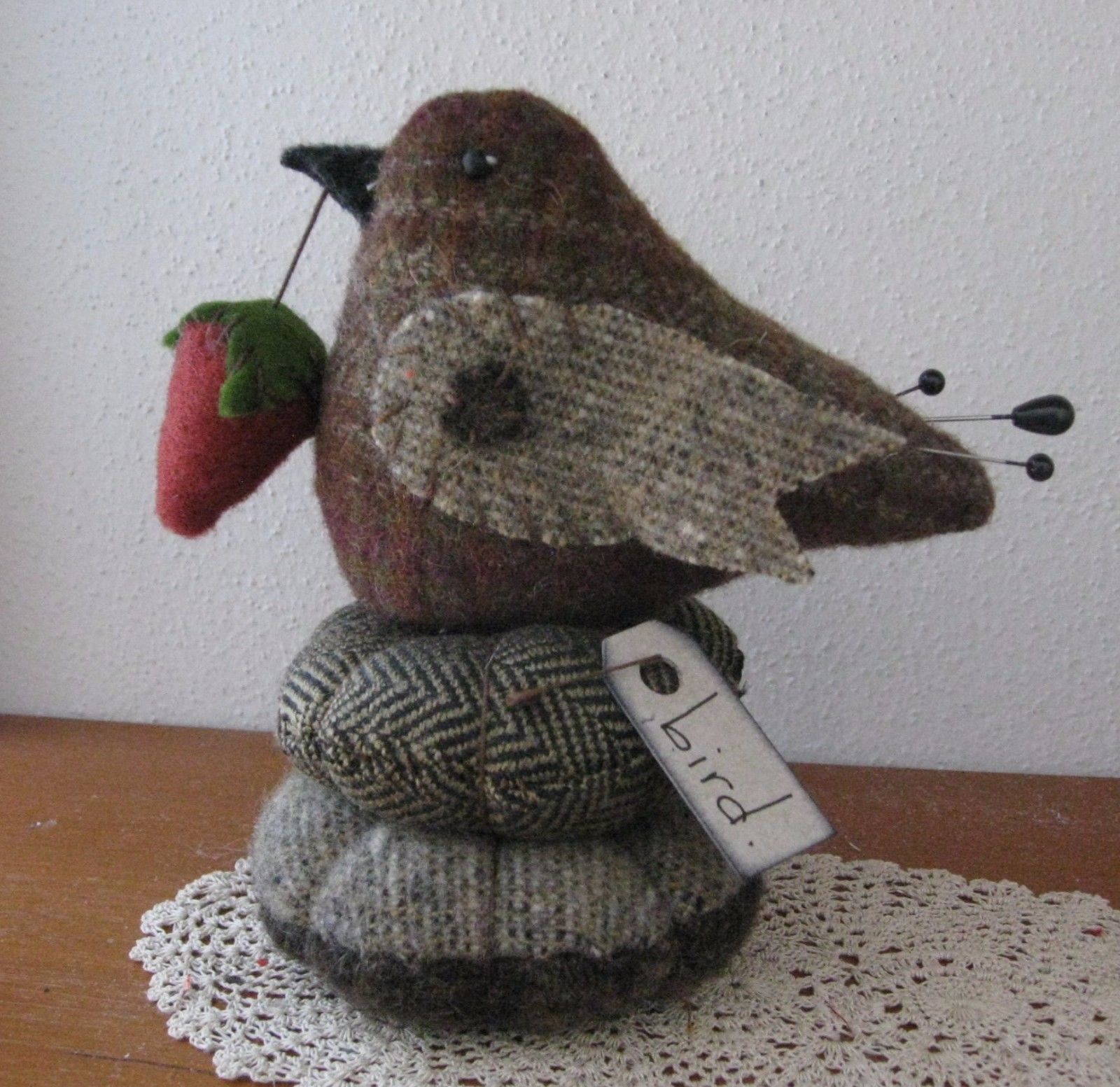 Title (ebay affiliate link): PRIMITIVE WOOL BIRD STRAWBERRY MAKE DO PIN CUSHION PFATT