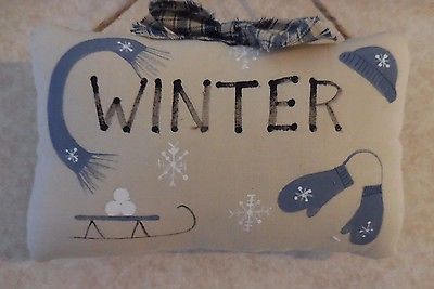 Title (ebay affiliate link): Primitive WINTER Pillow Tuck Folk Art Painted Mittens Scarf Hat Sled Snowballs