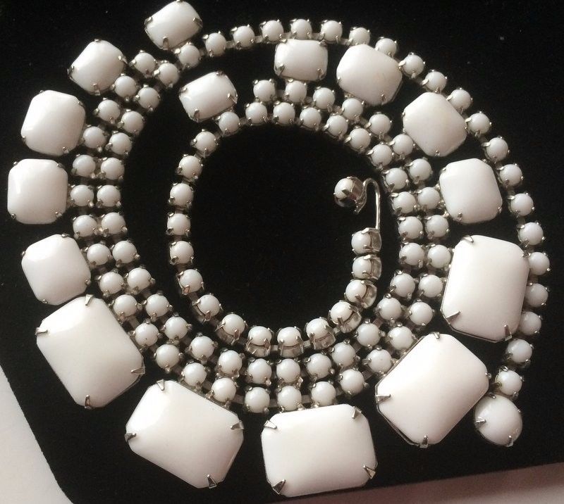 Title (ebay affiliate link): Vintage Necklace White Milk Glass Rhinestone SIlver tone Unsigned Wiess Silver