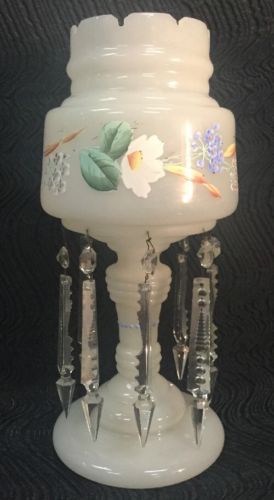 Title (ebay affiliate link): HAND PANTED MILK GLASS CANDLE LAMP WITH HAND CUT CRYSTAL HANGING PRISMS