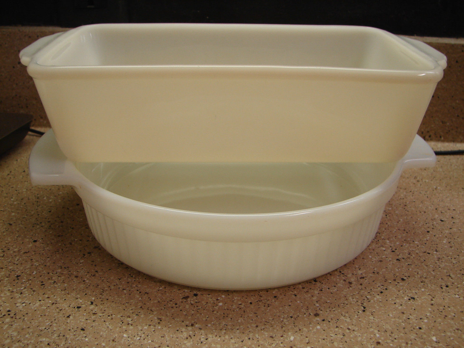 Title (ebay affiliate link): 2 Vintage Fire-King Anchor Hocking White Milk Glass Loaf Pan 1 qt & round 1 qt.