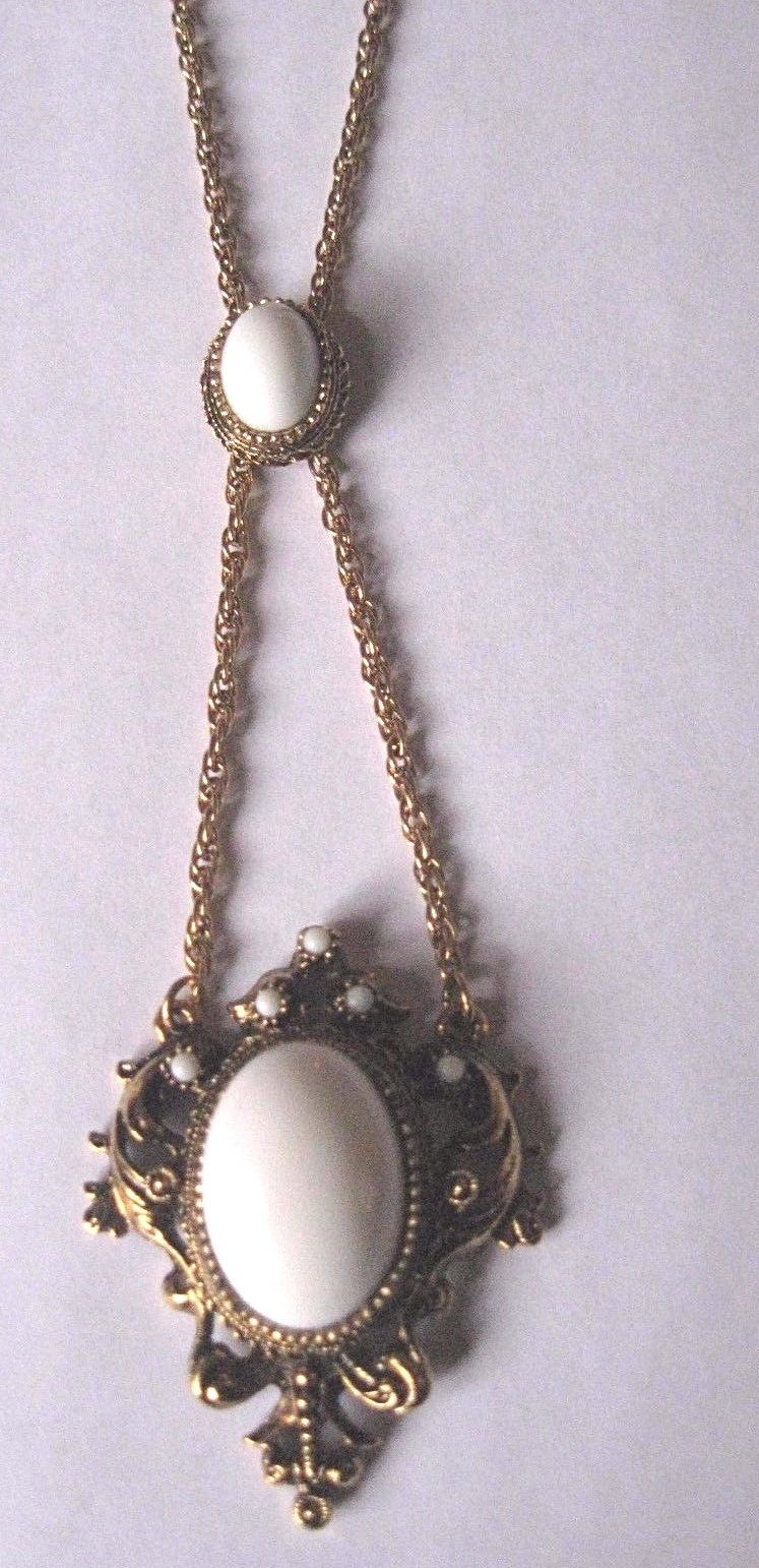 VINTAGE ART NOUVEAU WHITE MILK GLASS LARIAT PENDANT NECKLACE