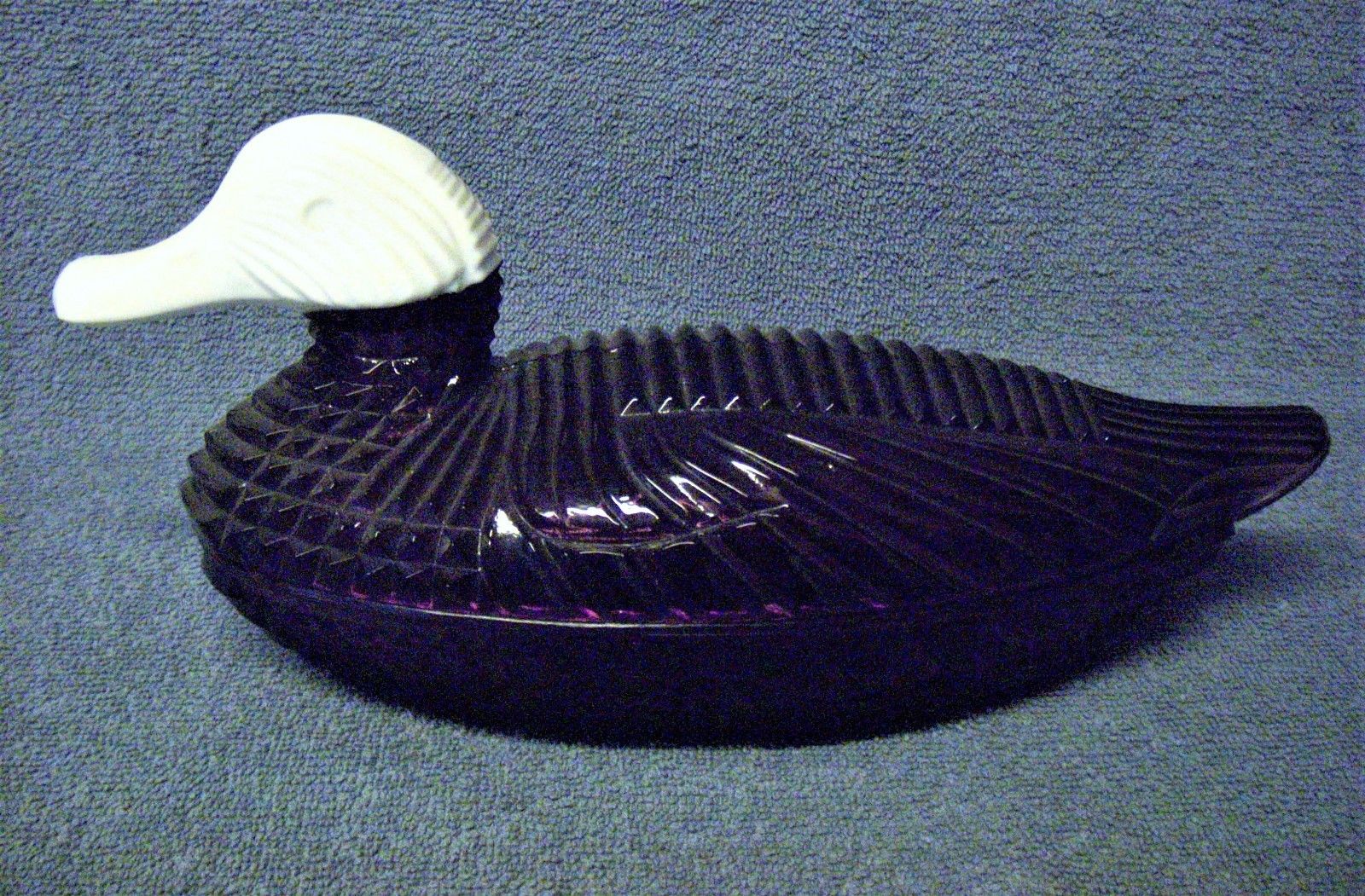 Title (ebay affiliate link): Vintage LG. WRIGHT Glass DUCK Covered Dish - White Milk Glass Head & Purple Body