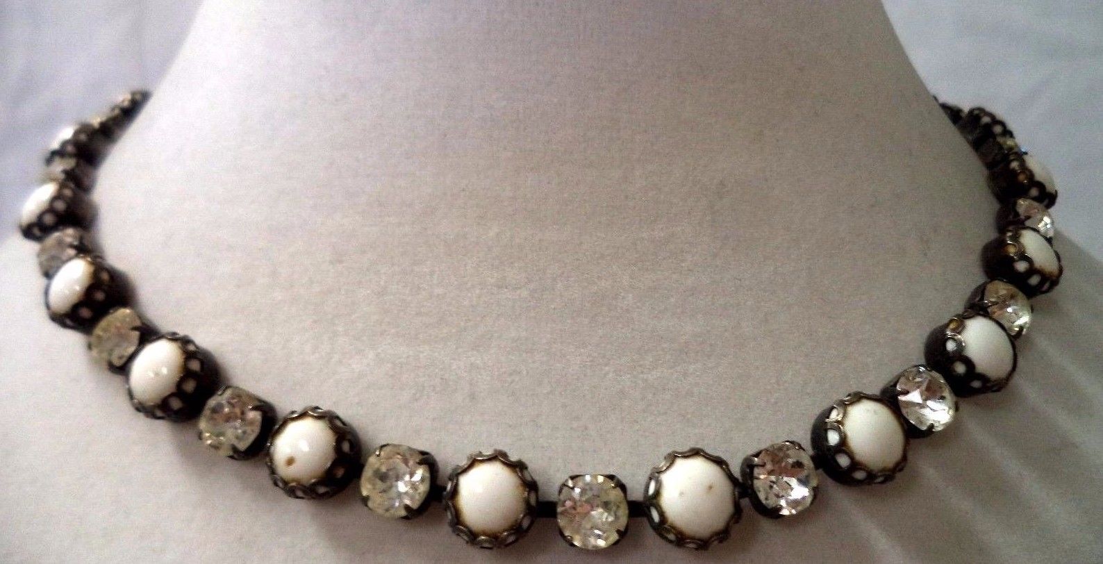 STUNNING VINTAGE ESTATE HIGH END MILK GLASS & RHINESTONE 16" NECKLACE!!! G1080