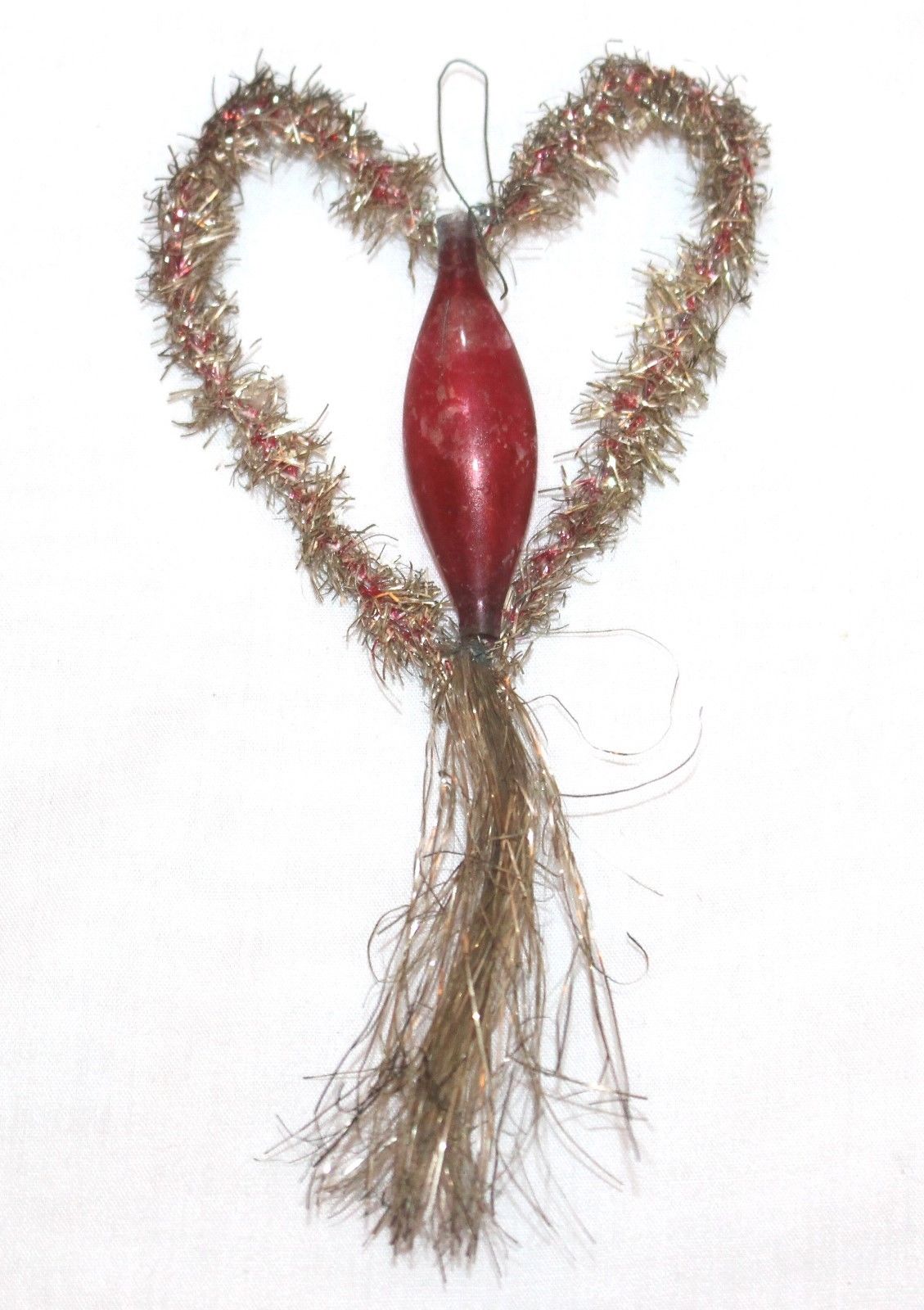 Title (ebay affiliate link): Early 1900s Silver & Red Tinsel Heart, Red Oval Bead inside. Germany.