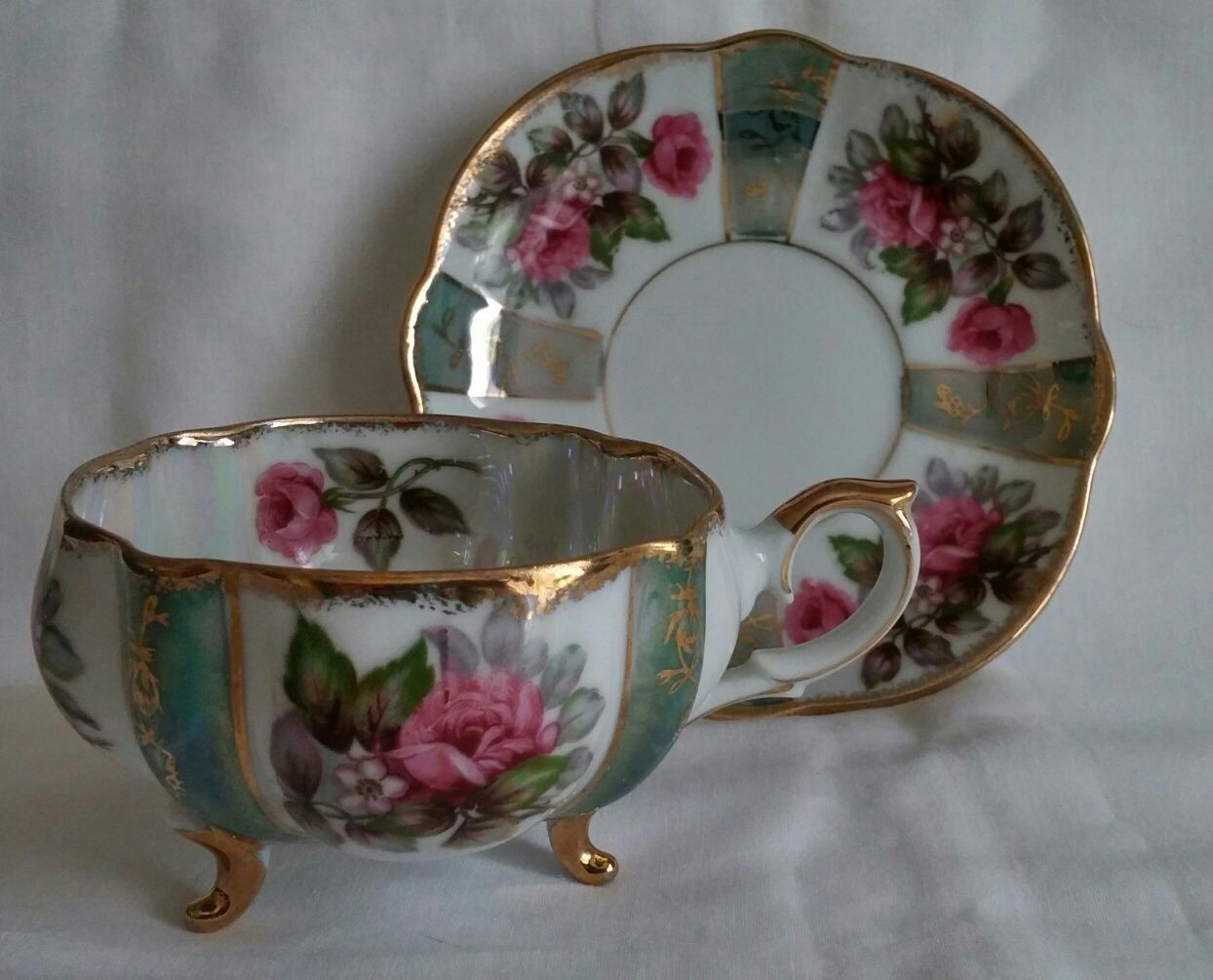 Napco 3 Footed Tea Cup & Saucer Hand Painted Roses Gold Trim