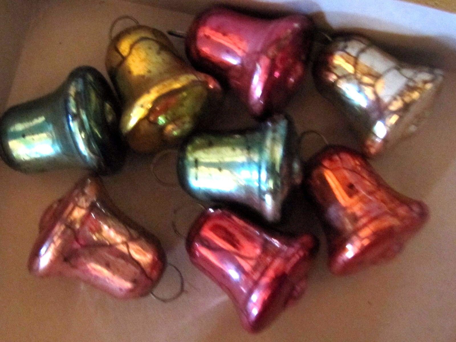 Vtg Glass Christmas Ornaments Small BELLS feather tree lot 8 Glass Shiny Brite