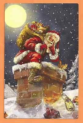 Title (ebay affiliate link): Christmas, Snow, Santa Claus Entering the chimney with Toy Bag, Moon, Postcard
