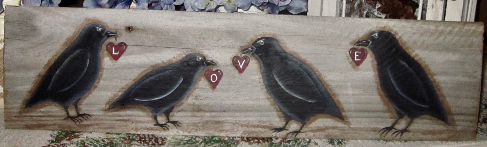 Title (ebay affiliate link): *~*PRIMITIVE*~* HP FOLK ART PRIM CROW *~* HEARTS *~* LOVE *~* OLD RECLAIMED WOOD