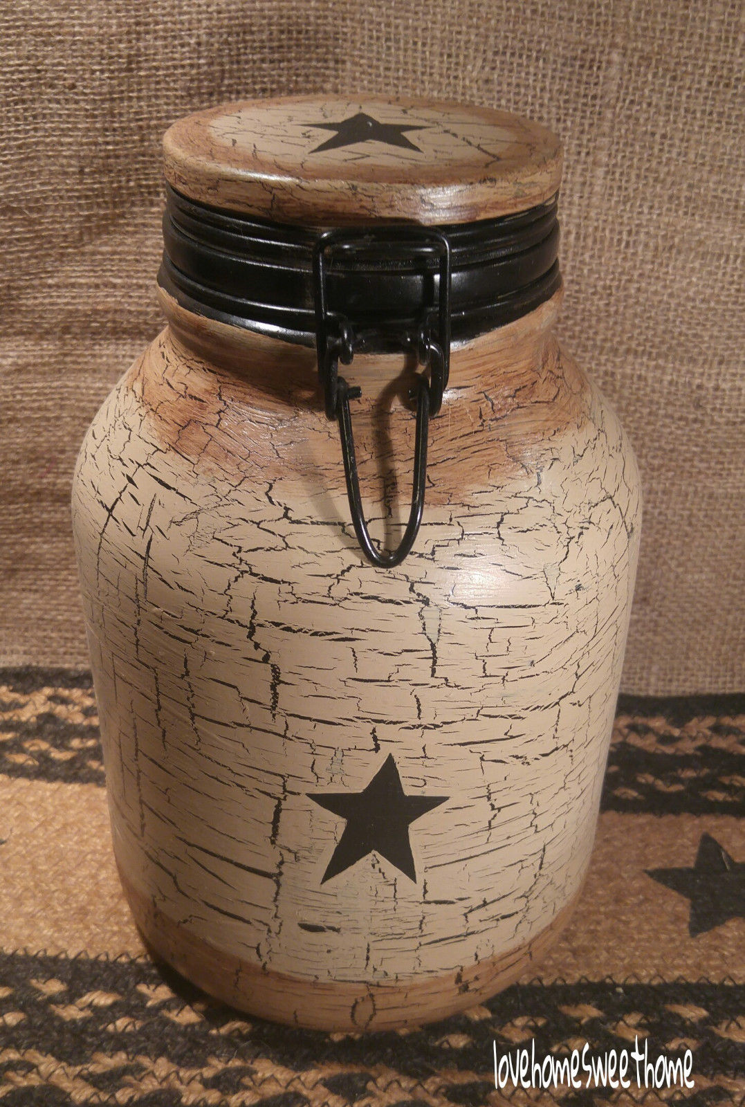 Title (ebay affiliate link): Primitive Crackle Tan & Black Stars Ceramic Crock Cookie Canister Country Decor
