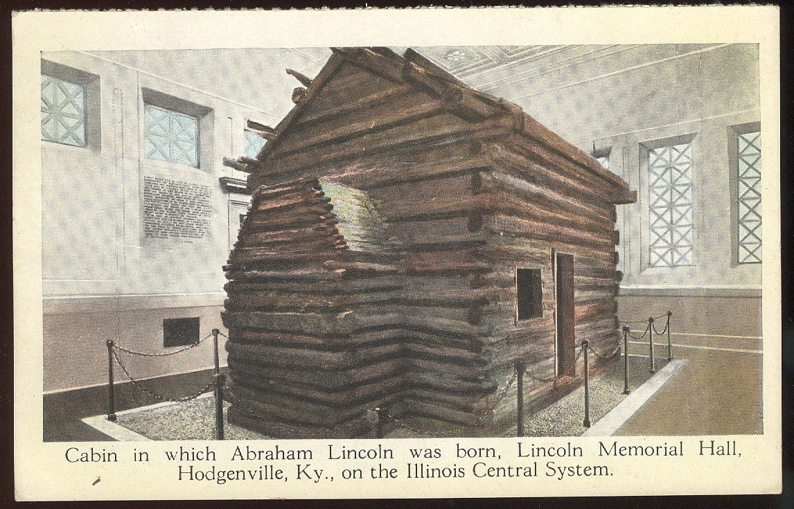 ILLINOIS CENTRAL RAILROAD POST CARD, LINCOLN CABIN, HODGENVILLE, KY.