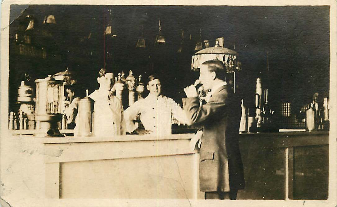 Real Photo Postcard Soda Fountain Jerks & Customer - Warrensburg, Missouri??