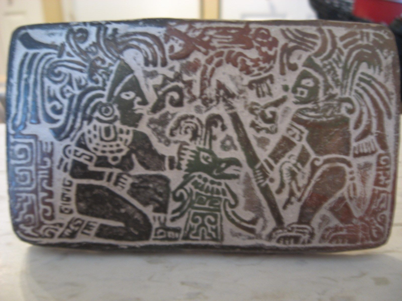 Title (ebay affiliate link): MAYAN Stamp depicting 2 warriors, 5 inches by 3 inches.
