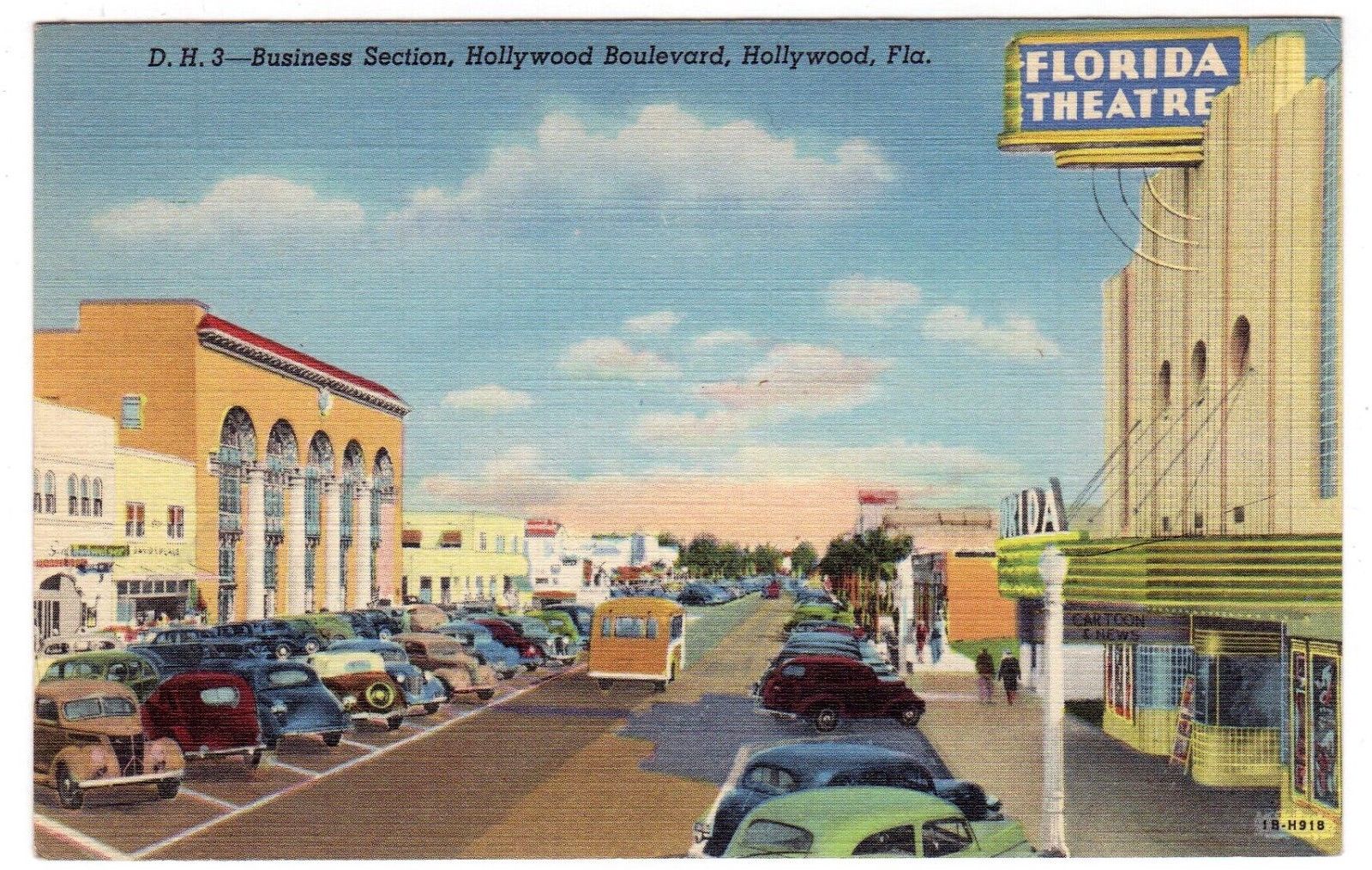 VINTAGE 1940''S BUSINESS SECTION HOLLYWOOD BOULEVARD HOLLYWOOD FLORIDA POSTCARD