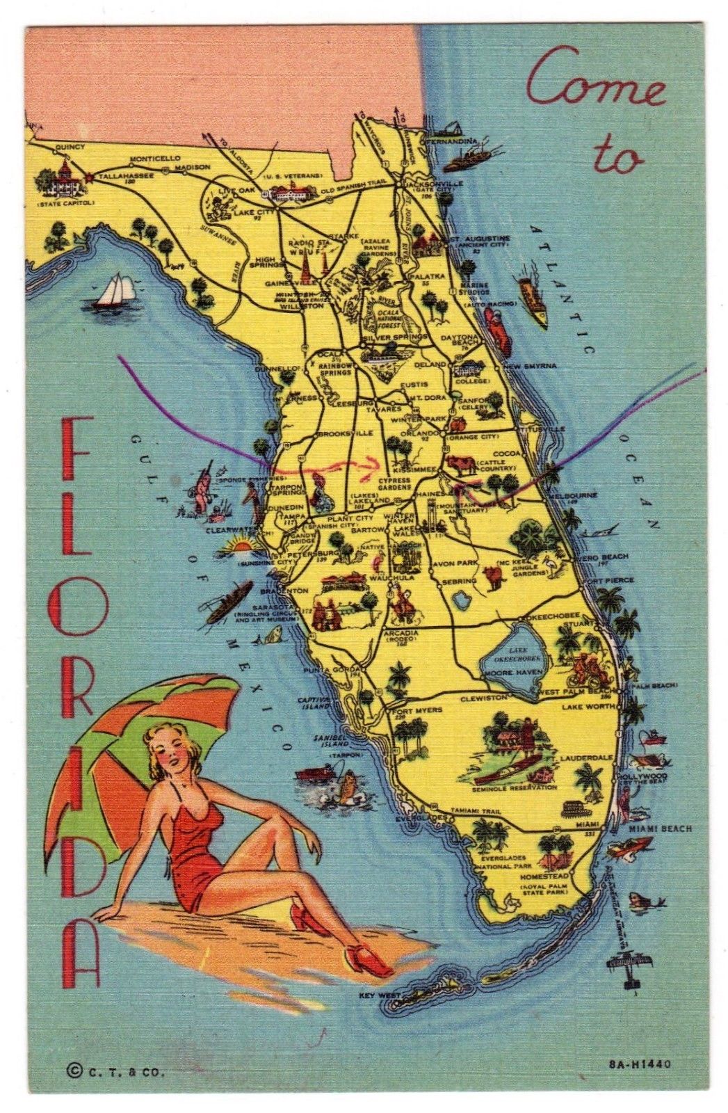 VINTAGE 1940''S LARGE LETTER COME TO FLORIDA BATHING BEAUTY ATTRACTIONS MAP PC