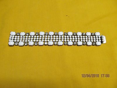 VINTAGE MILK GLASS & RHINESTONE SILVER TONE BRACELET, NO HALLMARK