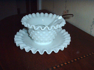 Title (ebay affiliate link): Fenton Milk Glass Hobnail Condiment Bowl with Saucer & Glass Ladle