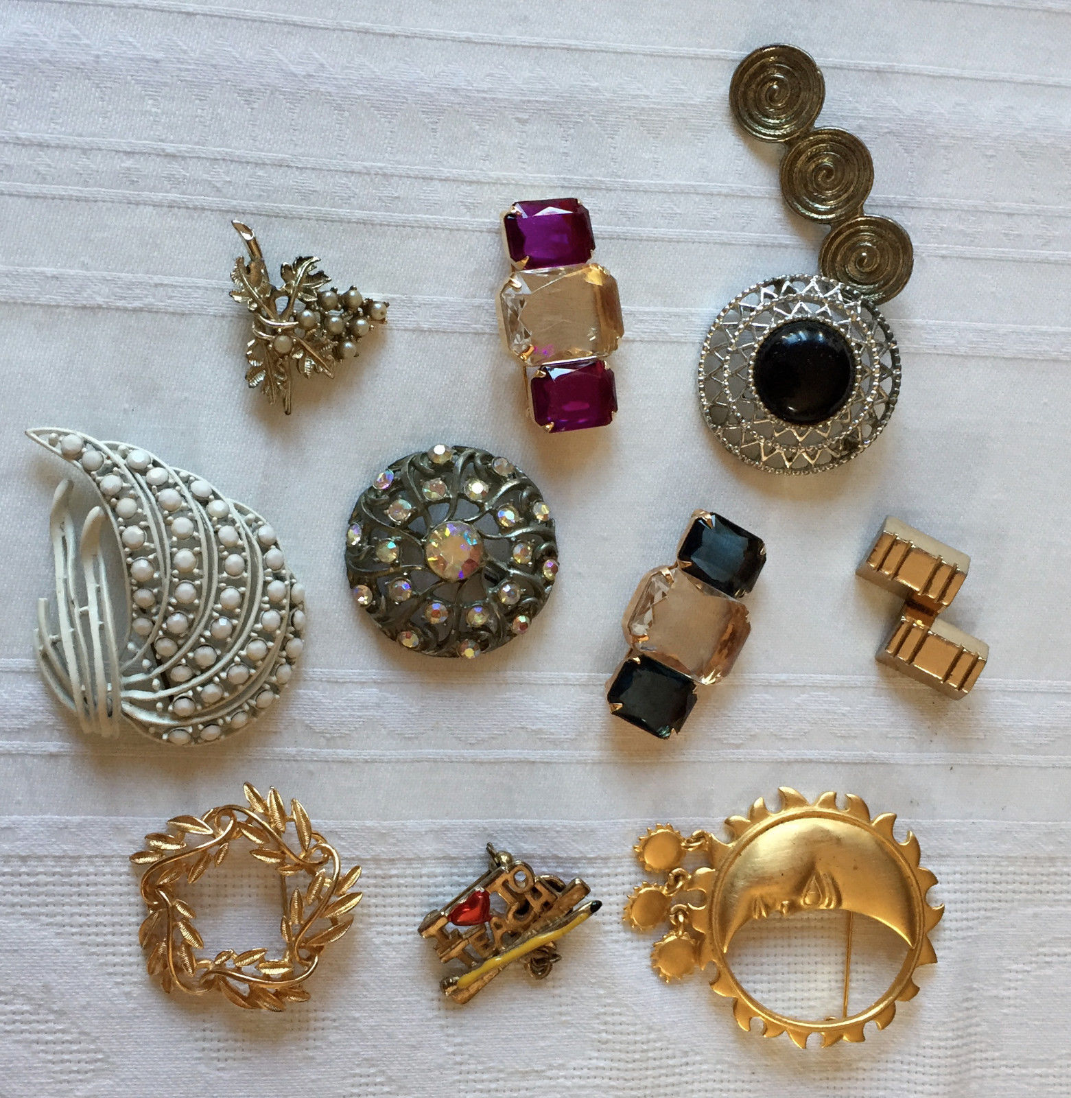 Title (ebay affiliate link): Vintage Lot of 11 Brooch Pins Rhinestone Milk Glass Pearl Enamel Most Signed