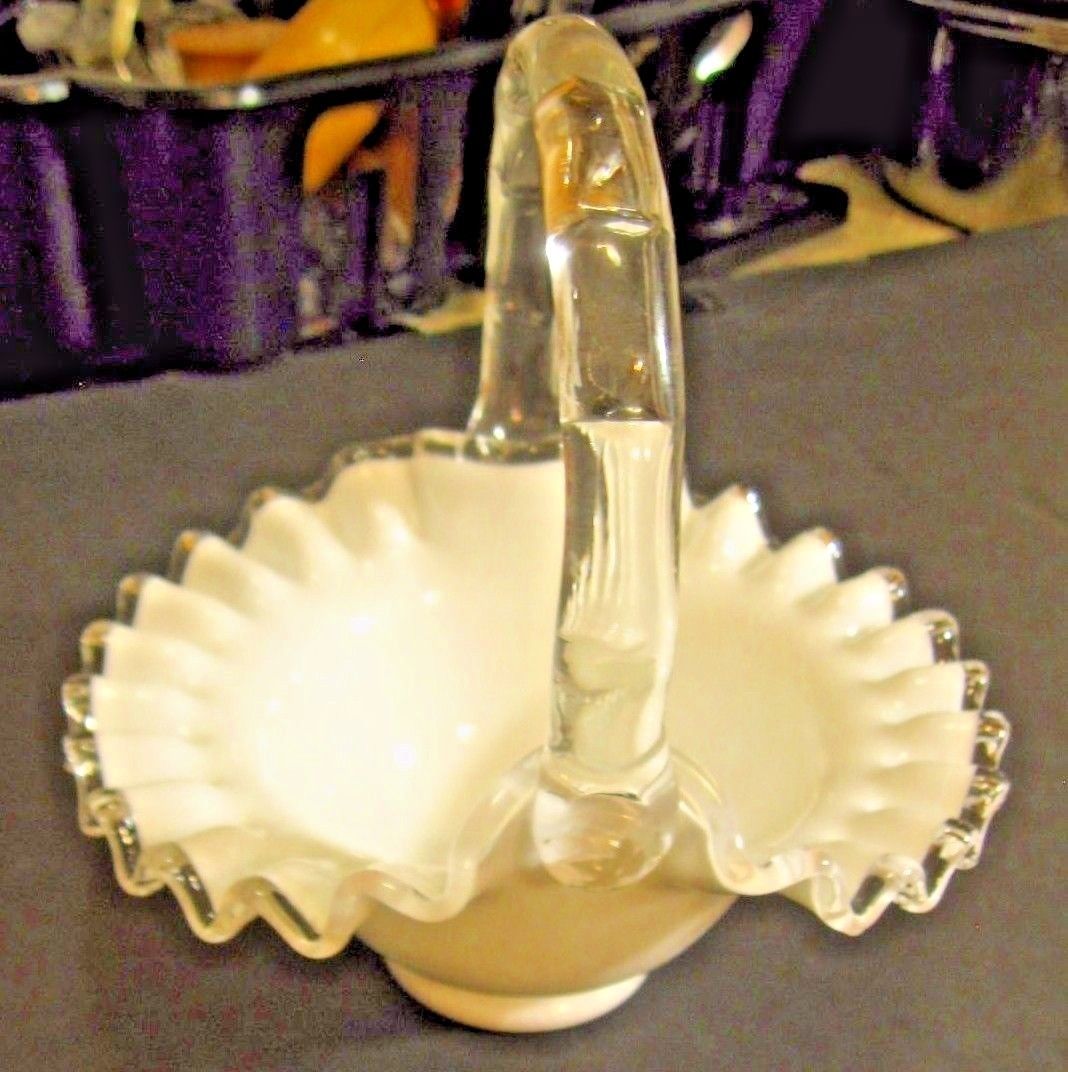 Title (ebay affiliate link): Fenton Silver Crest Vintage Milk Glass Basket Clear Handle & Ruffled Edges