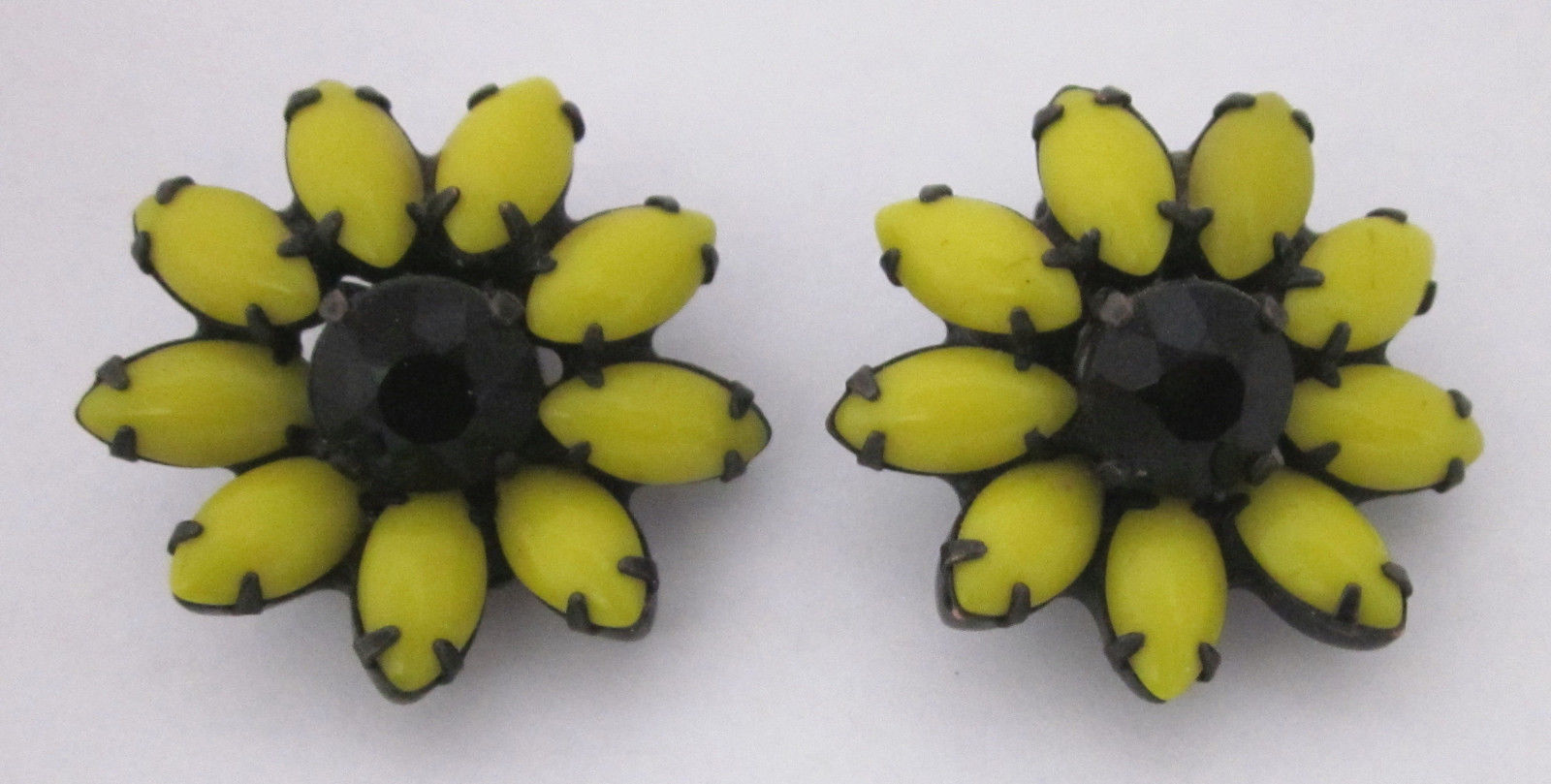 Title (ebay affiliate link): Vintage Yellow Milk Glass/Jet-Black Rhinestone Flower Earrings Weiss