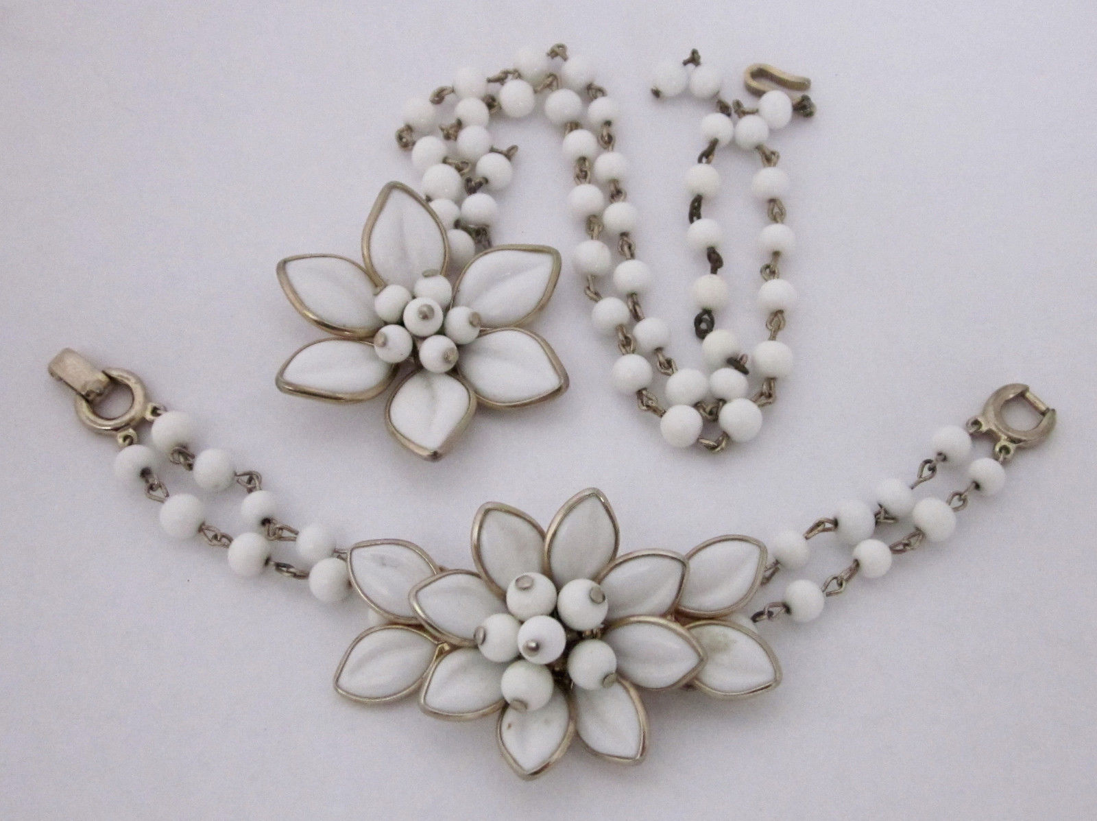 Vintage Milk Glass Flower Necklace Bracelet Trifari