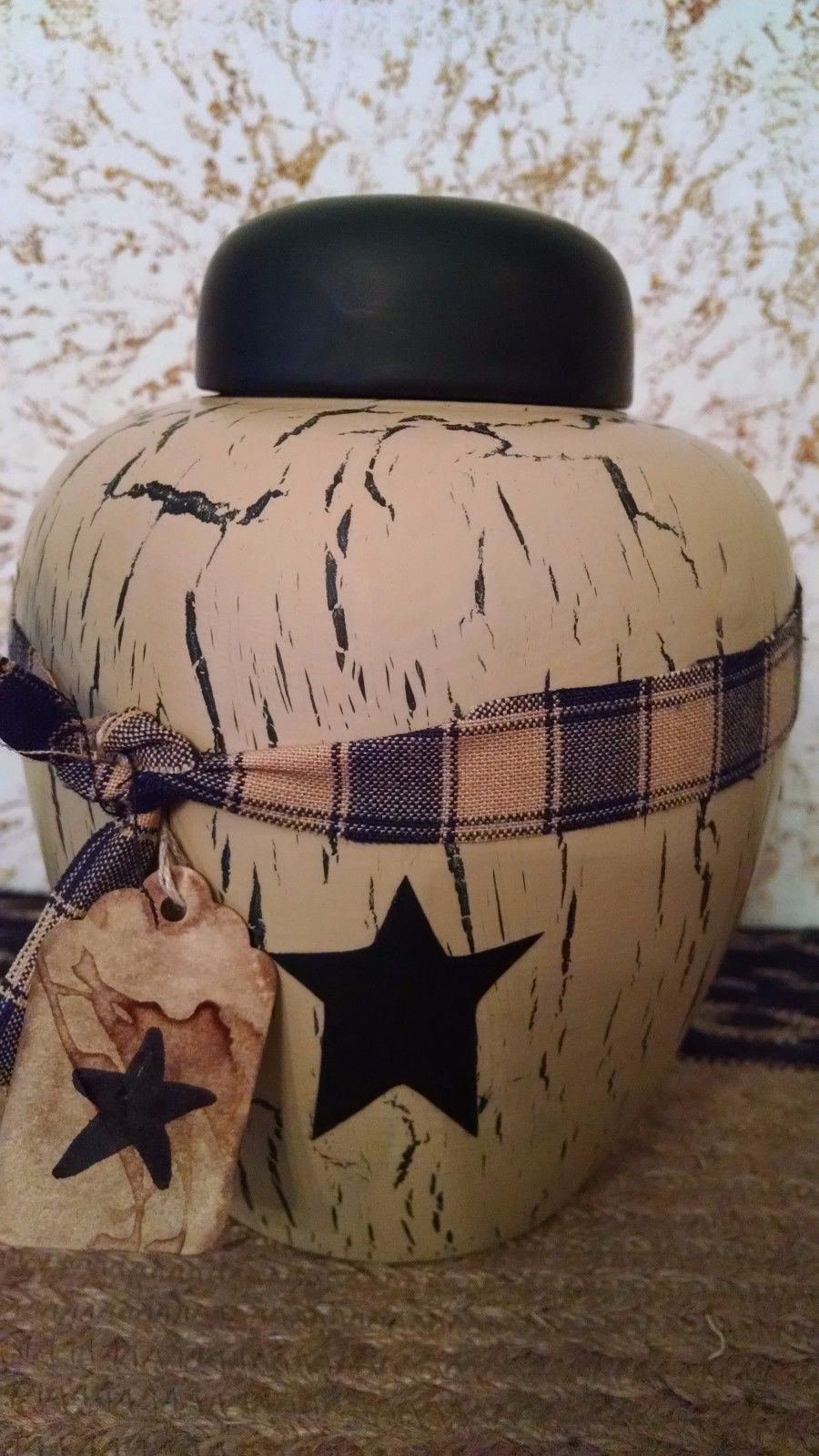 Title (ebay affiliate link): Primitive Crackled Decor Tan/Black Farmhouse Decor