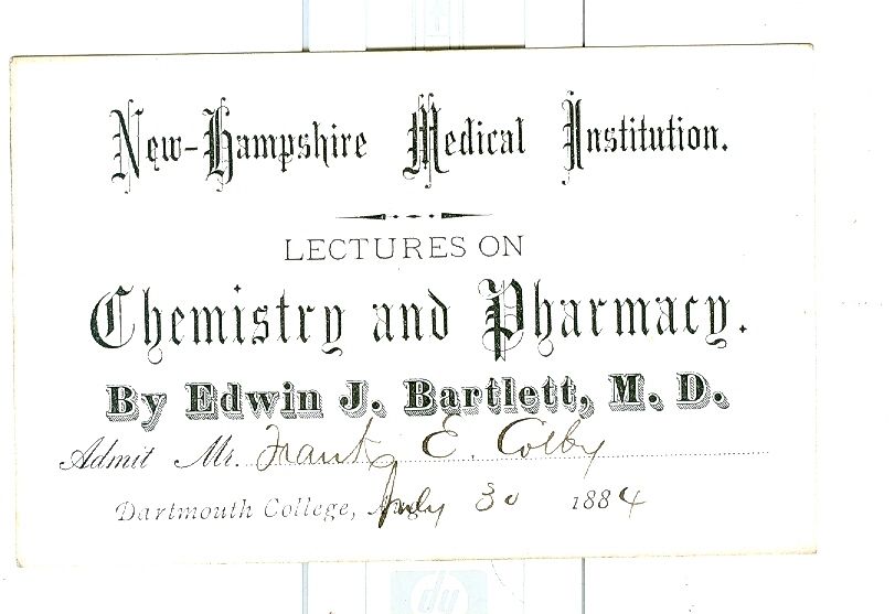1884 Admission Ticket Dartmouth College Chemistry & Pharmacy Lecture