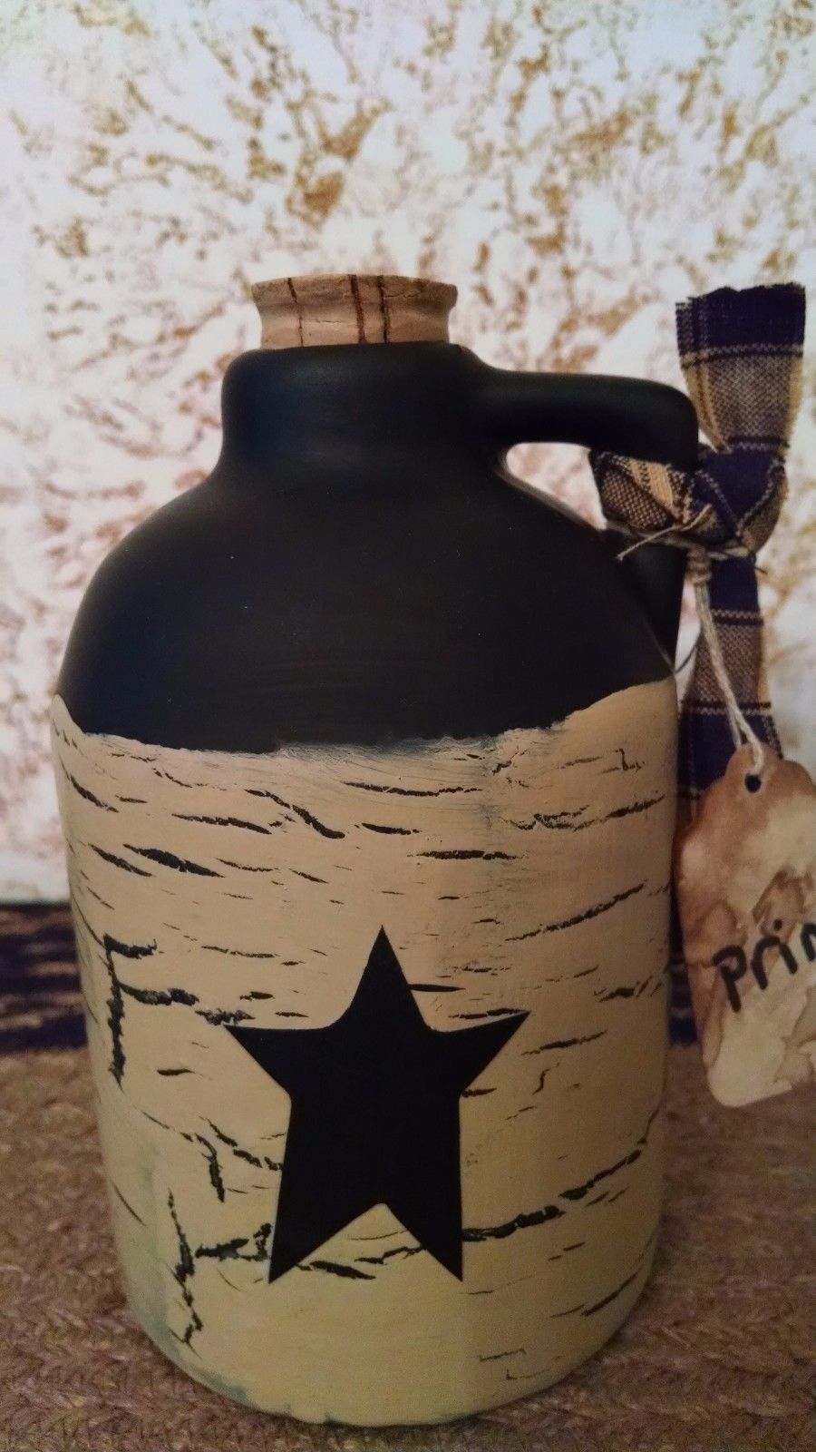 Title (ebay affiliate link): Primitive Crackled Jug Decor Tan/Black Farmhouse Decor
