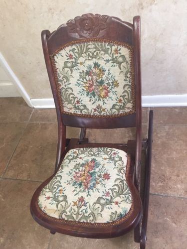 Title (ebay affiliate link): Vintage 1900-1910 Champion Folding Cherry Wood Sewing Rocking Chair Tapestry