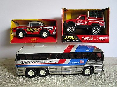 Title (ebay affiliate link): VINTAGE BUDDY L 3 PC LOT OF COCA-COLA TRUCK, GREYHOUND BUS AND 57 CHEVY