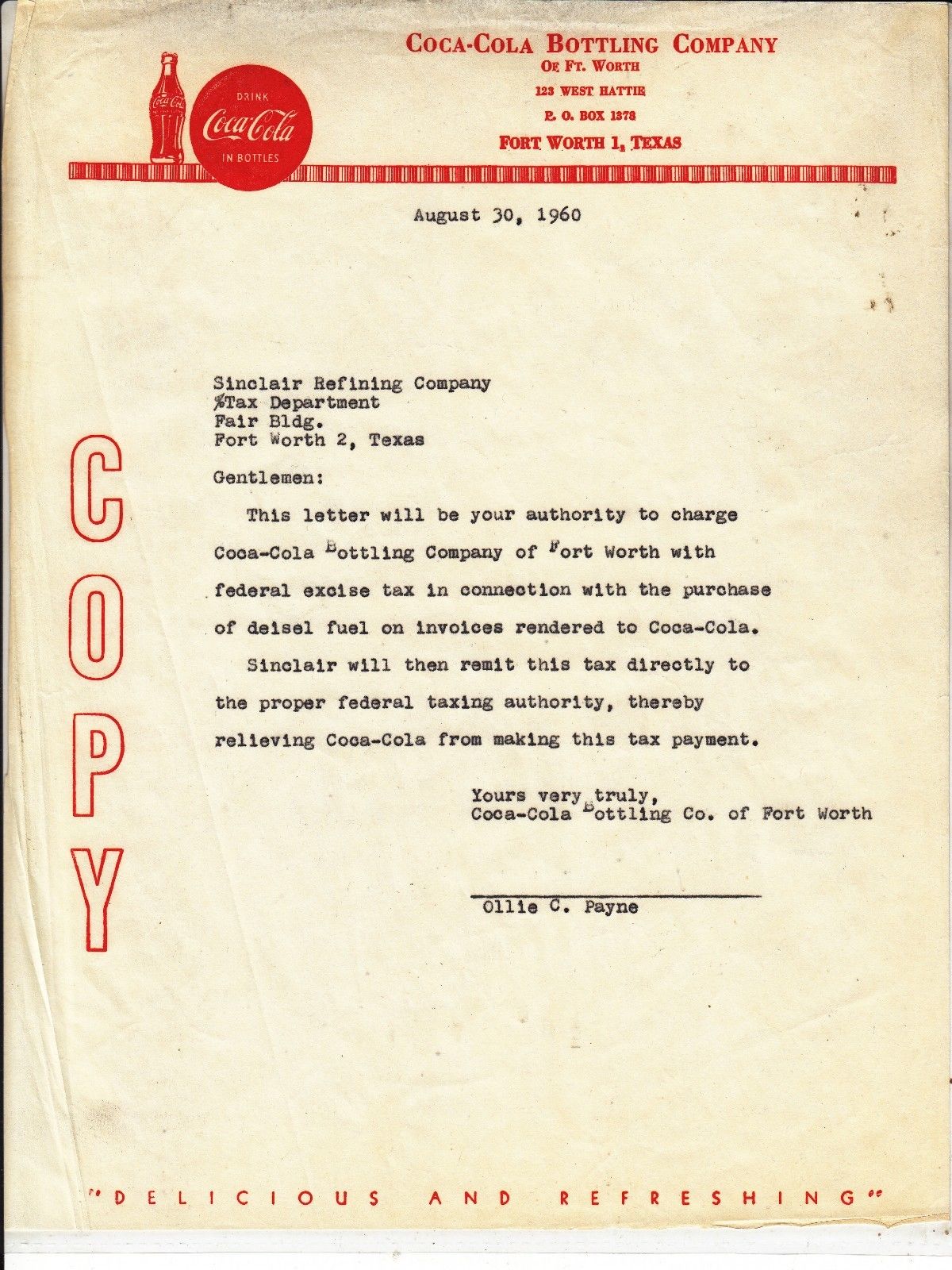 COCA-COLA BOTTLING CO. OF FORT WORTH TEXAS LETTERHEAD AUGUST 30, 1960