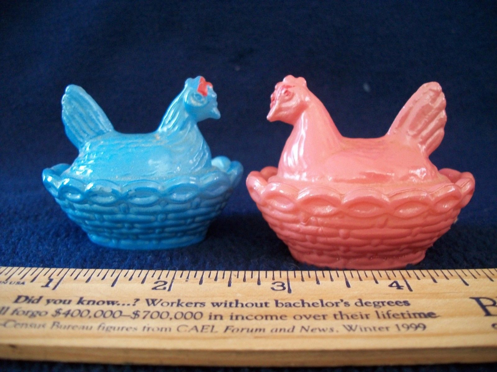 Title (ebay affiliate link): SET OF 2 VINTAGE BLUE & PINK MILK GLASS MINIATURE HEN ON A NEST SALT 2" X 2 1/2"