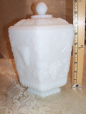 Title (ebay affiliate link): Anchor Hocking Fire King Milk Glass Cookie Jar Pedestal Hexagon Grape 9"