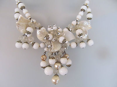 Vtg Art Milk Glass Crystal Flower Bib Necklace Dangle Signed West Germany WOW